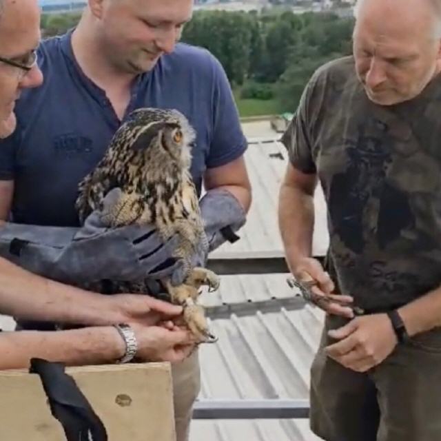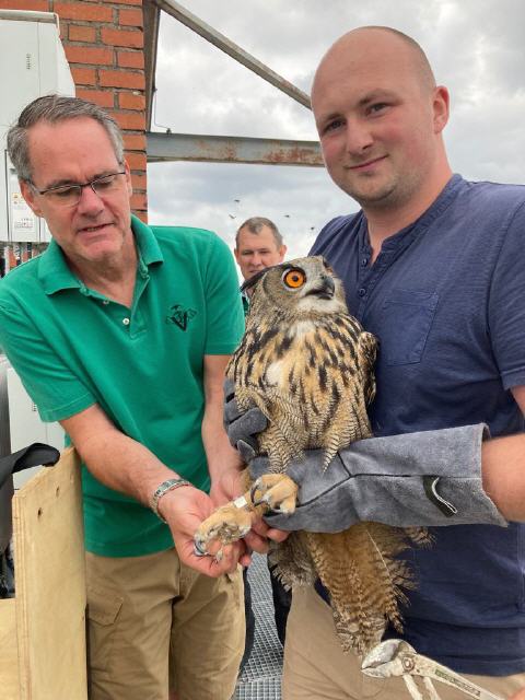 Uhu-Update: Nach 25 Tagen medizinischer Pflege und Reha kann er wieder an der Kongresshalle in Nürnberg ausgewildert werden. Dabei waren Frau Nora Vogt von der Stadt Nürnberg, die Falkner Nico Leisner und Milton Reichert, der Beringer der Vogelwarte Radolfzell Detlef Schiesser und Rainer Hussong. Nach seiner Beringung auf dem Dach der Kongresshalle flog der ehemalige Patient eine Runde, um sich dann in der Nähe seines Brutkastens abzustellen und zu orientieren. Der Uhu schien sofort zu wissen, dass er wieder zuhause ist.