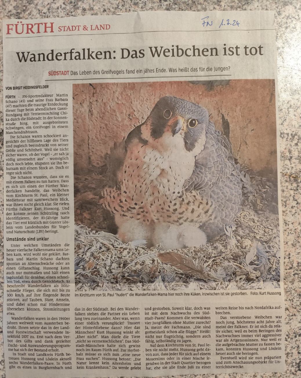 Das Rätsel un das zuletzt vermisste Zirndorfer Wanderfalken-Paar ist gelöst, die beiden Greifvögel sind – wohl nach einer überstürtzen Flucht – wieder aufgetaucht. Falkner Kurt Hussongs Spurensuche mit Happy End: